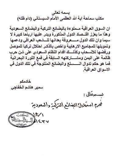 به گزارش رصدمراغا به نقل از خبرگزاری دانشجو ؛ حضرت آیت الله سید علی سیستانی، مرجع عالیقدر شیعه با صدور یک فتوا مصرف کالاهای سعودی و ترکیه ای را حرام اعلام کرد.