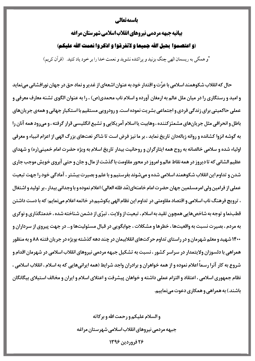 جبهه مردمی نیروهای انقلاب اسلامی شهرستان مراغه با حضور جمعی از فعالین سیاسی اجتماعی و رزمندگان و نیروهای طرفدار انقلاب و مردممدار با صدور بیانیه ای اعلام موجودیت کرد.