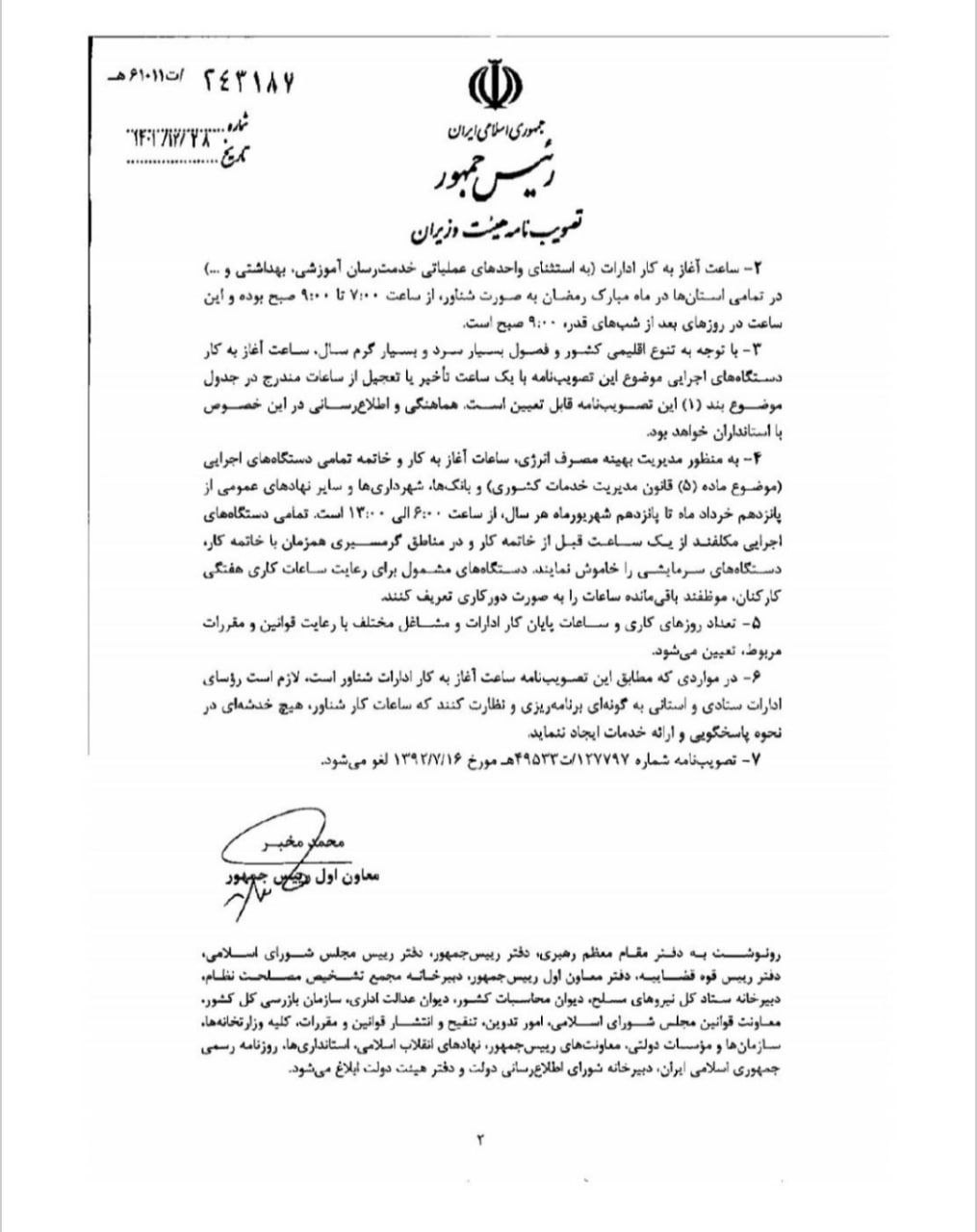 ساعات آغاز به کار ادارات بر اساس تصویبنامه هیئت وزیران در تاریخ ۱۴۰۱/۱۲/۲۸ خواهد بود.