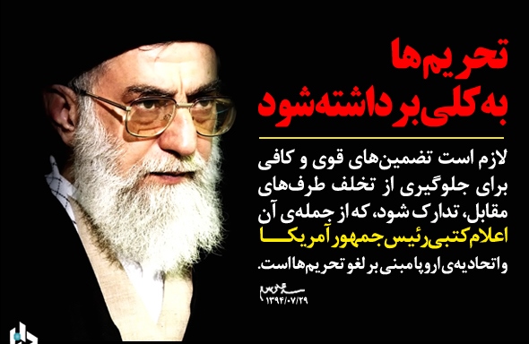 مراغه -پایگاه خبری رصد؛ به نقل از پایگاه اطلاع رسانی دفتر مقام معظم رهبری ، حضرت آیت الله خامنهای رهبر معظم انقلاب اسلامی در نامهای به آقای روحانی رئیسجمهور و رئیس شورایعالی امنیت ملی، با اشاره به بررسیهای دقیق و مسئولانه برجام در مجلس شورای اسلامی و شورایعالی امنیت ملی و عبور این موافقتنامه از مجاری قانونی، دستورات مهمی را در خصوص رعایت و حفظ منافع ملی و مصالح عالیه کشور صادر و با برشمردن تأکیدات و الزامات ۹ گانه در اجرای برجام، مصوبه جلسه ۶۳۴ مورخ ۱۹/۵/۹۴ شورای عالی امنیت ملی را با رعایت این موارد و الزامات تأیید کردند.