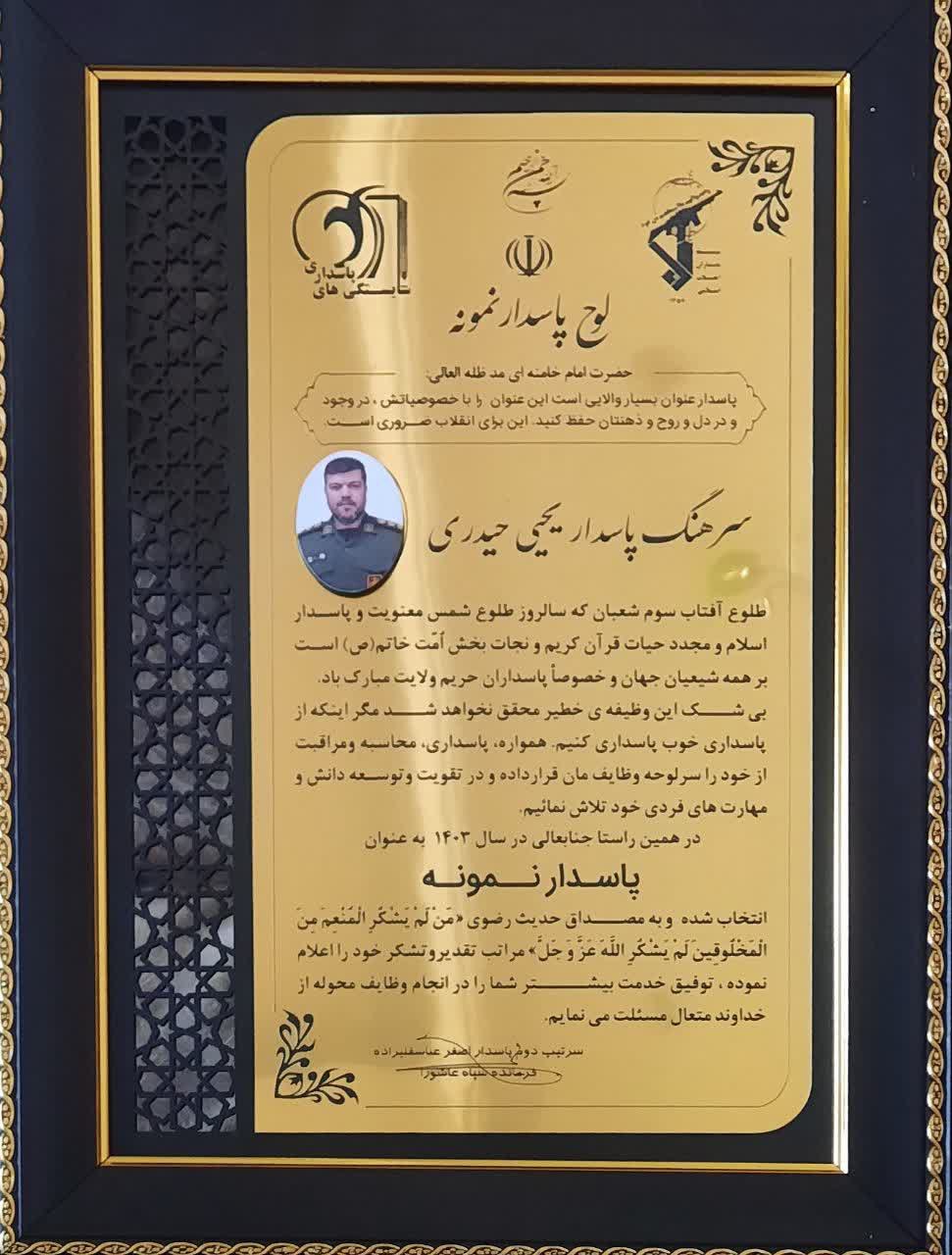 به مناسبت سالروز میلاد با سعادت امام حسین علیه السلام و روز پاسدار ، سرهنگ یحیی حیدری به عنوان پاسدار نمونه سپاه عاشورا معرفی شد