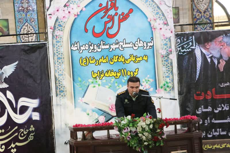 به گزارش رصدمراغا در محفل انس با قرآن که با حضور فرماندهان،مسئولان و جمعی ازکارکنان نیروهای مسلح شهرستان ویژه مراغه برگزار شد، قاریان برجسته نیروهای مسلح ، آیاتی چند از کلام نور را قرائت کردند و در ادامه شاعران و مداحان و ذاکران اهل بیت به مداحی پرداختند.